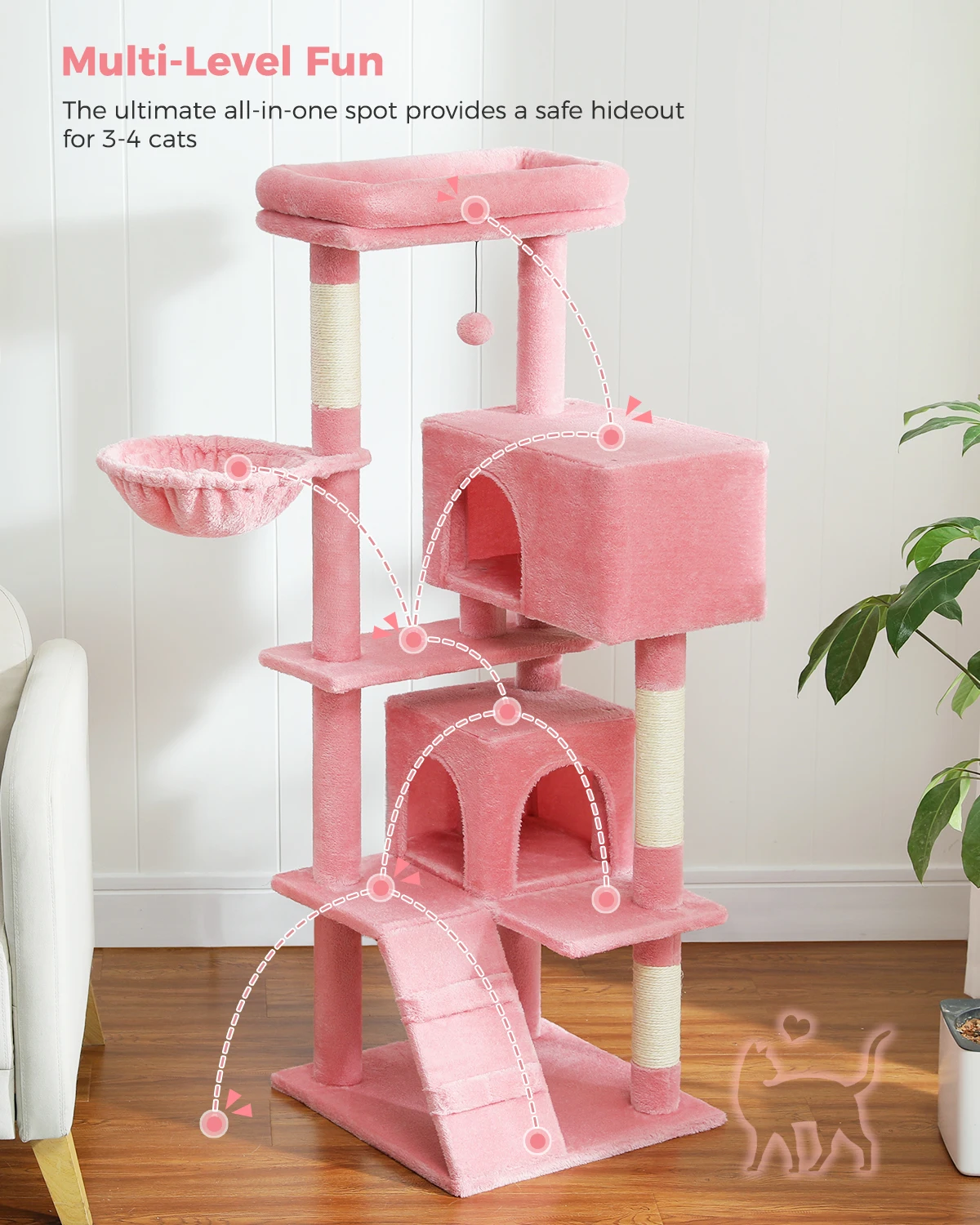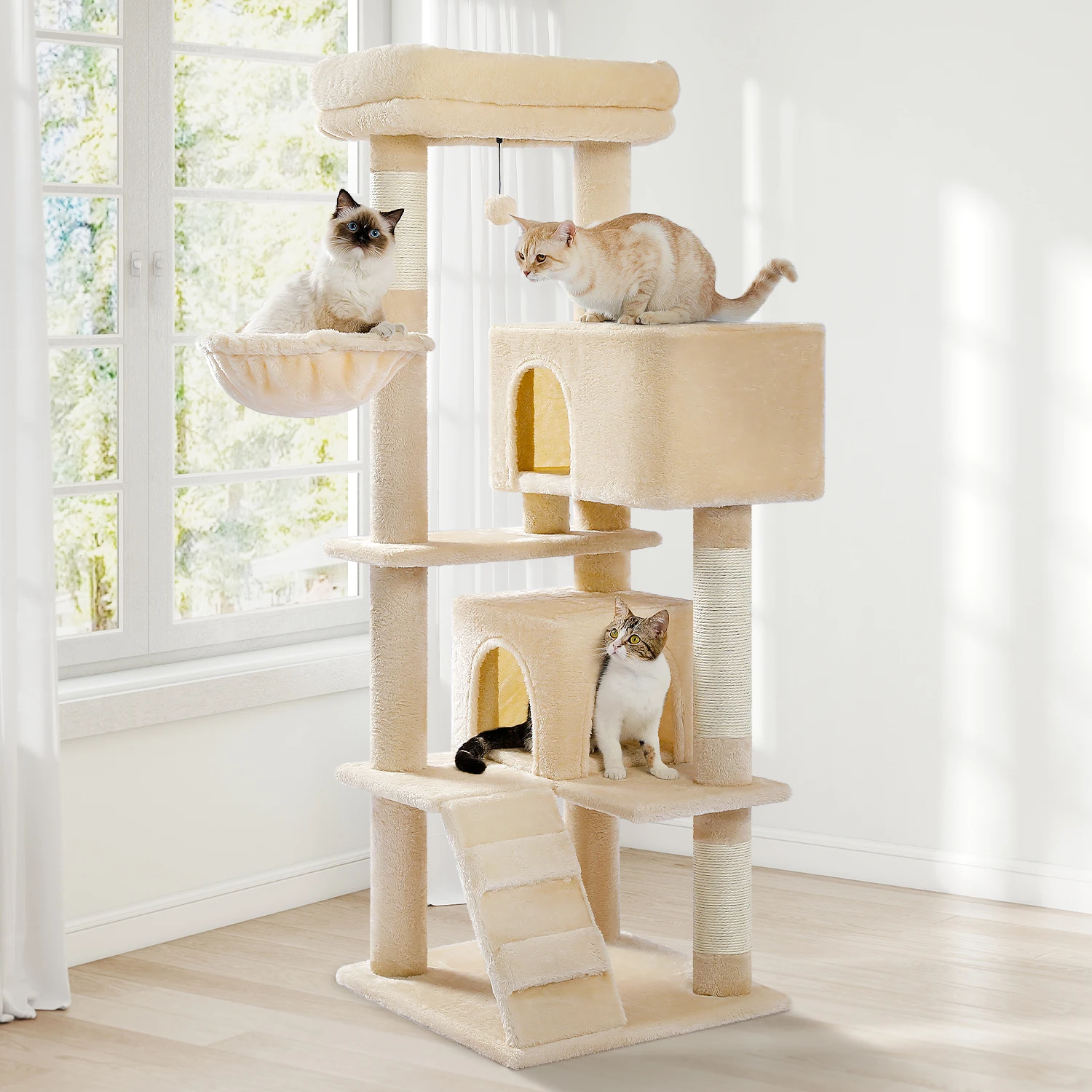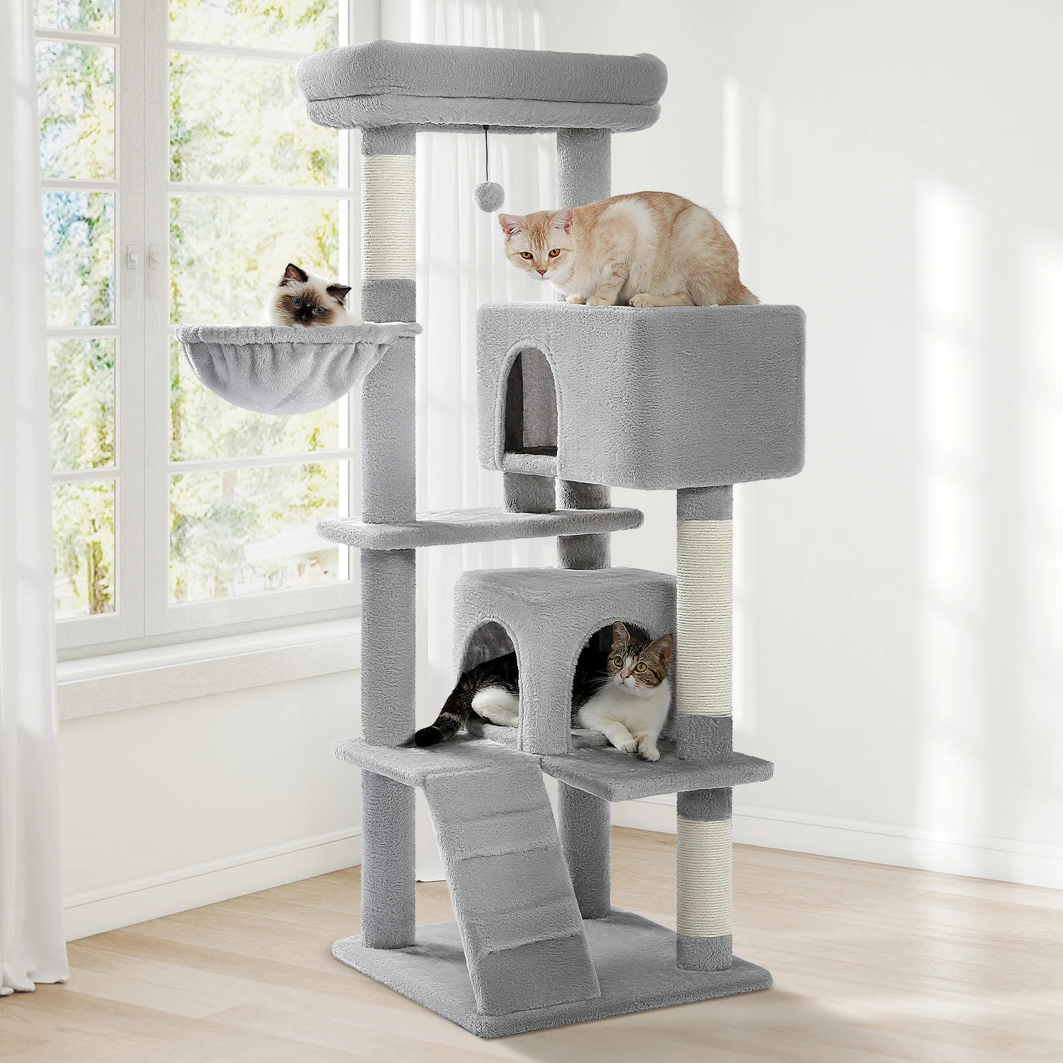 1. All-in-one spot provides Large cats a safe hideout, a soft pompom, scratching posts and lookout perches, it is an activity center which is perfect for nap and entertainment.