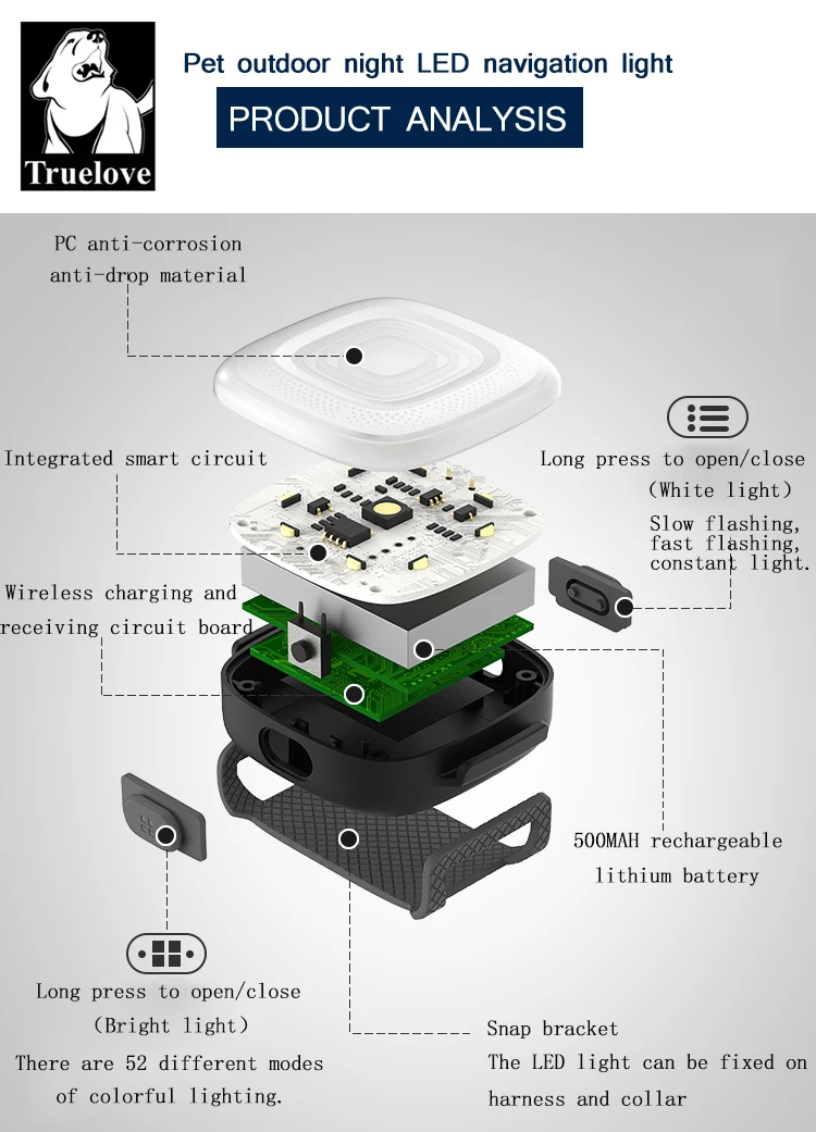 ①Three flashing modes of white light: always on, slow flashing, fast flashing. High-brightness flash, easy to track your dog at night to prevent loss.TRUELOVE LED